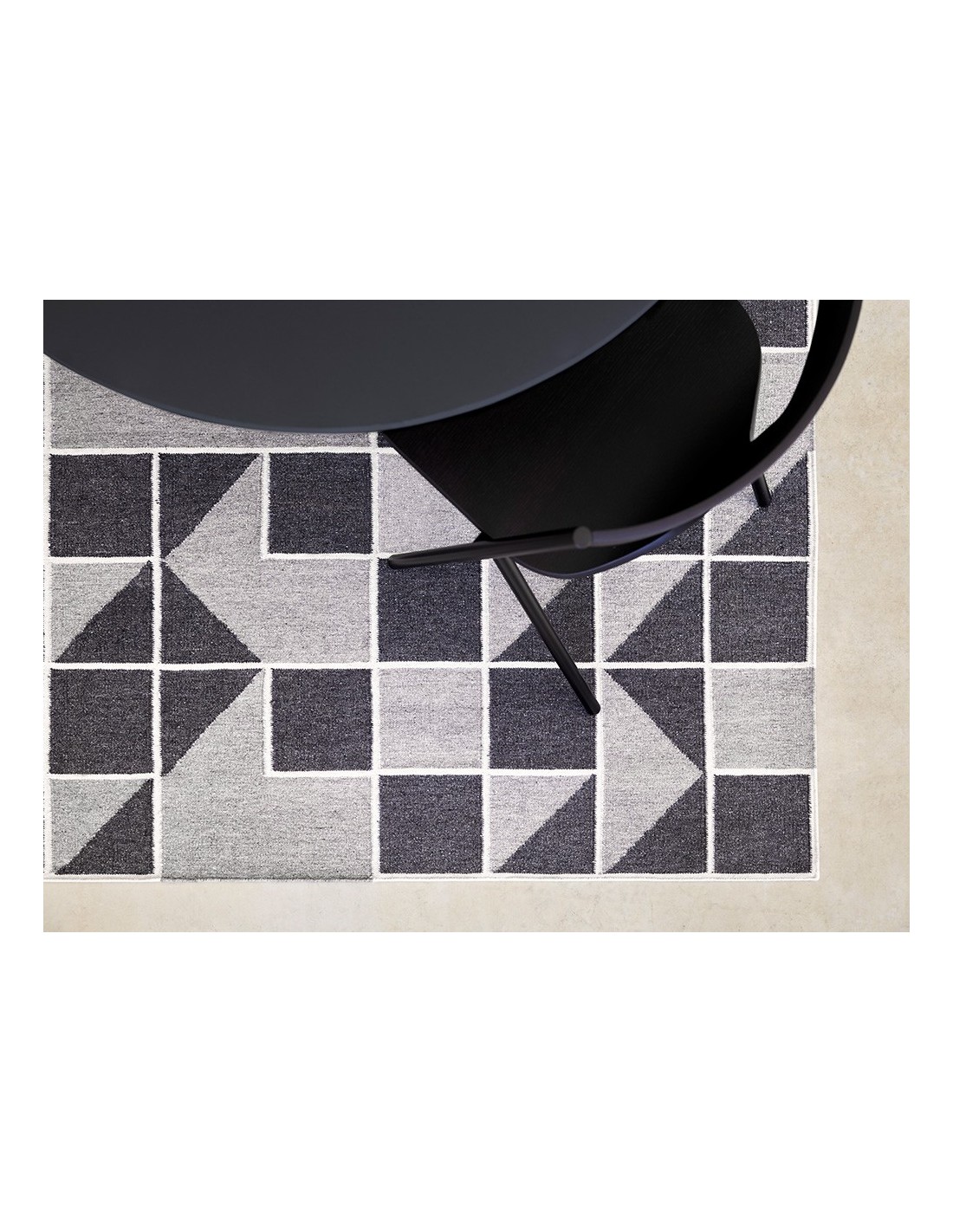 Discover the Modica Rug Grey 170x240, where modern style meets geometric elegance. Featuring a striking pattern of squares and triangles in dark charcoal and soft grey, this rug adds depth and sophistication to any room. Its flat weave offers a sleek, low-profile look that fits seamlessly into contemporary spaces. The neutral tones create a balanced backdrop, making it easy to pair with various décor styles. Perfect for living rooms or offices, this quality rug combines artistic flair with practical durability, enhancing your space with subtle texture and timeless appeal.