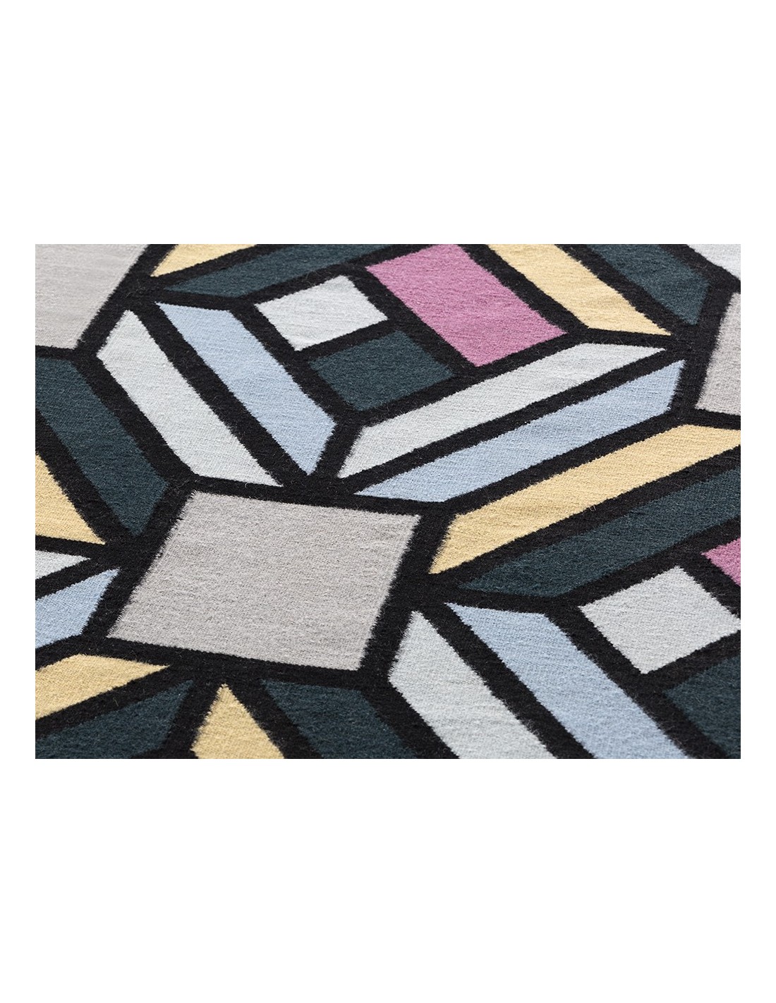 Bring a fresh, modern touch to your home with the Parquet Rug Tetragon Blue 213x312. Featuring a captivating geometric pattern of interlocking tetragons, this rug blends soft blues, gentle peach, muted pinks, and subtle grays, all highlighted by bold black outlines. Its sleek flat weave offers a low-profile look that fits effortlessly under furniture, while the dynamic parquet-inspired design adds depth and style to any room. Perfect for living rooms or dining areas, this quality rug combines timeless appeal with contemporary flair, making it a standout piece in any interior.