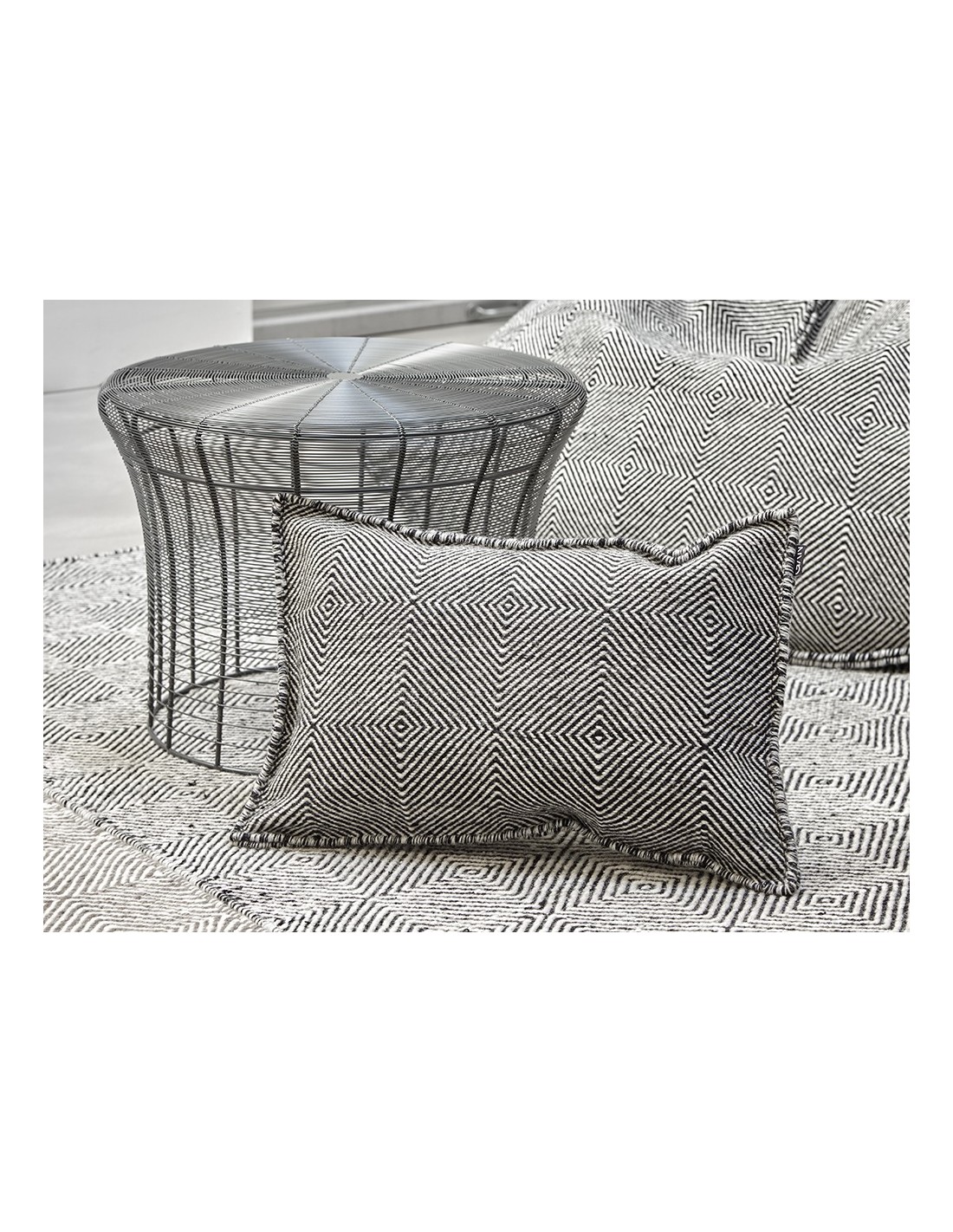 This is the Black cushion from the Sail collection, handmade in India using the Dhurrie technique with 100% virgin wool, on manual looms. The hypnotic rhombus pattern in this collection is a contemporary revision of the traditional Dhurrie aesthetics.