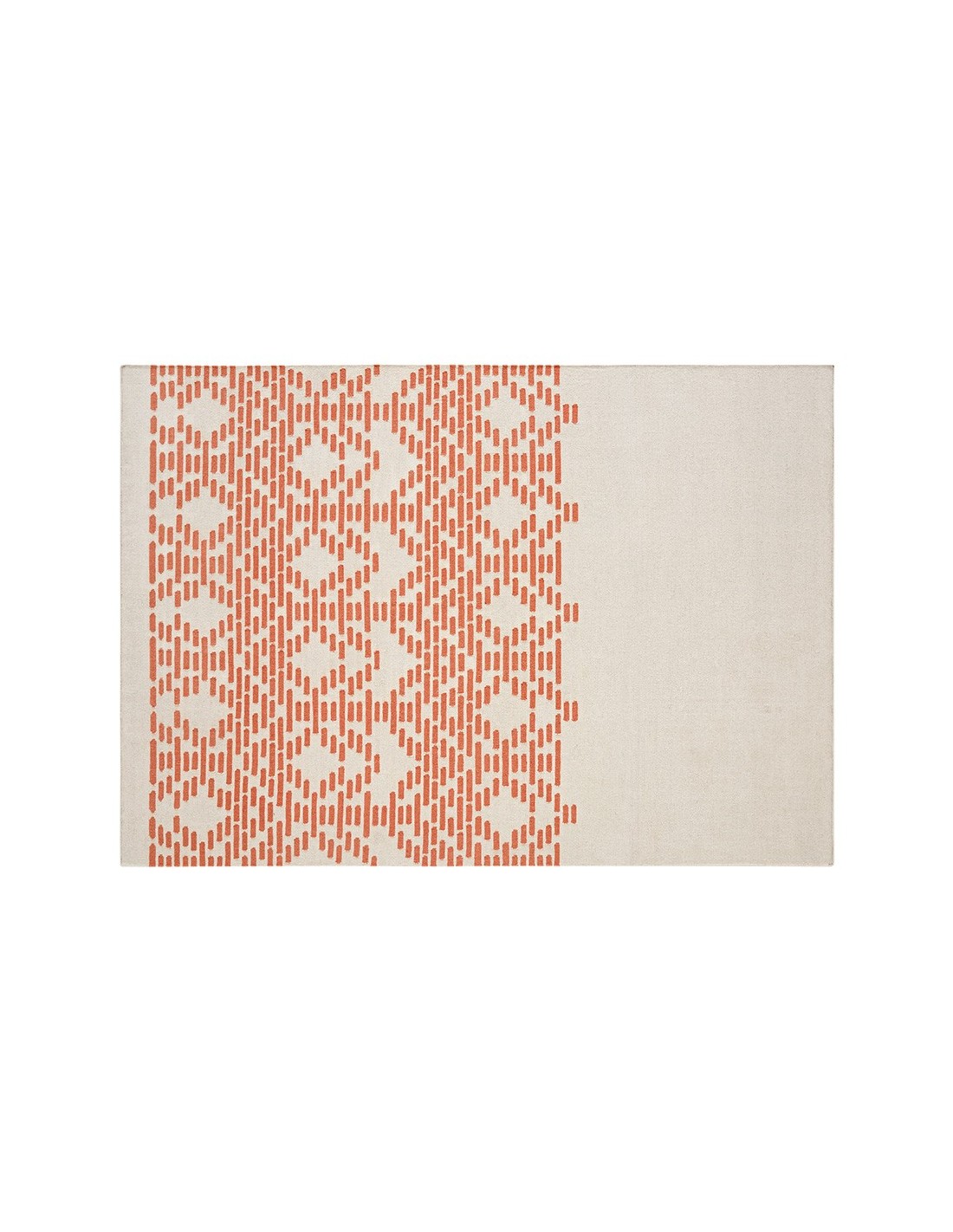 Transform your living space with the Thay Rug Taupe 150x200, a stunning example of quality rugs that blend traditional craftsmanship with contemporary style. This exquisite rug, designed by María Mengual and crafted in India, showcases a unique kilim weaving technique that adds texture and depth to any room. Its taupe base color creates a warm, neutral backdrop, while the intricate burnt orange geometric pattern adds a vibrant yet tasteful pop of color, making it a perfect centerpiece for modern interiors.