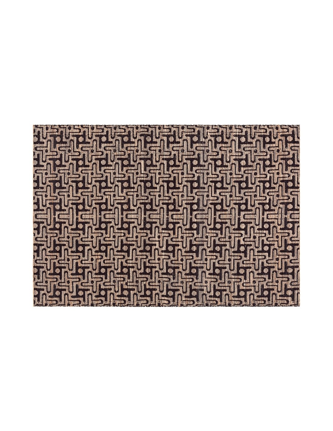Elevate your living space with the Twiggy Rug Black 200x300, a stunning example of quality rugs that blend contemporary style with traditional craftsmanship. This exquisite rug, crafted using the kilim technique in India, showcases a captivating geometric pattern in rich black and warm beige tones. The intricate design features interlocking shapes and subtle dots, creating a dynamic visual rhythm that adds depth and character to any room.