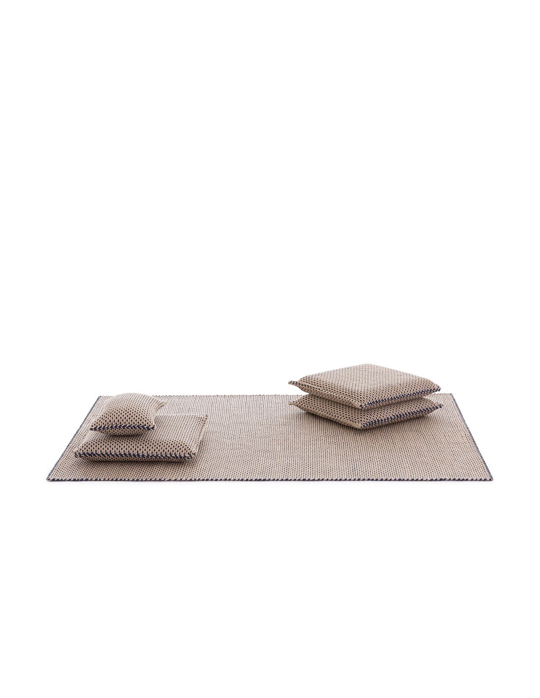 Un dettaglio che cattura l’attenzione è la precisione della tessitura, che crea un effetto visivo piacevole e uniforme, conferendo al tappeto un aspetto elegante e curato. Il tocco del designer Alejandra Gandía-Blasco Lloret si percepisce nella scelta cromatica e nella composizione equilibrata del pattern, che richiama le atmosfere nomadi e naturali.