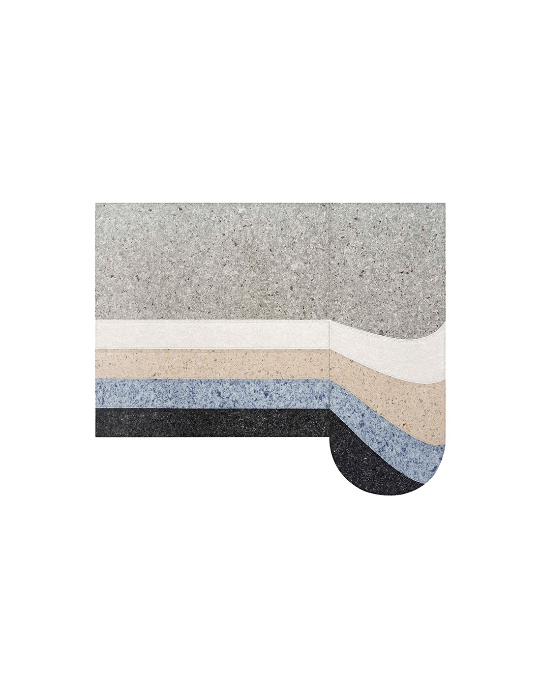 Il design si distingue per la combinazione di tonalità naturali e sofisticate: un grigio chiaro che domina la parte superiore, seguito da strisce orizzontali in bianco, beige, azzurro e nero, con un dettaglio arrotondato che aggiunge movimento e originalità alla composizione. Questa palette cromatica versatile si adatta facilmente a diversi stili di arredamento, dal minimalista al moderno, creando un’atmosfera accogliente e contemporanea.