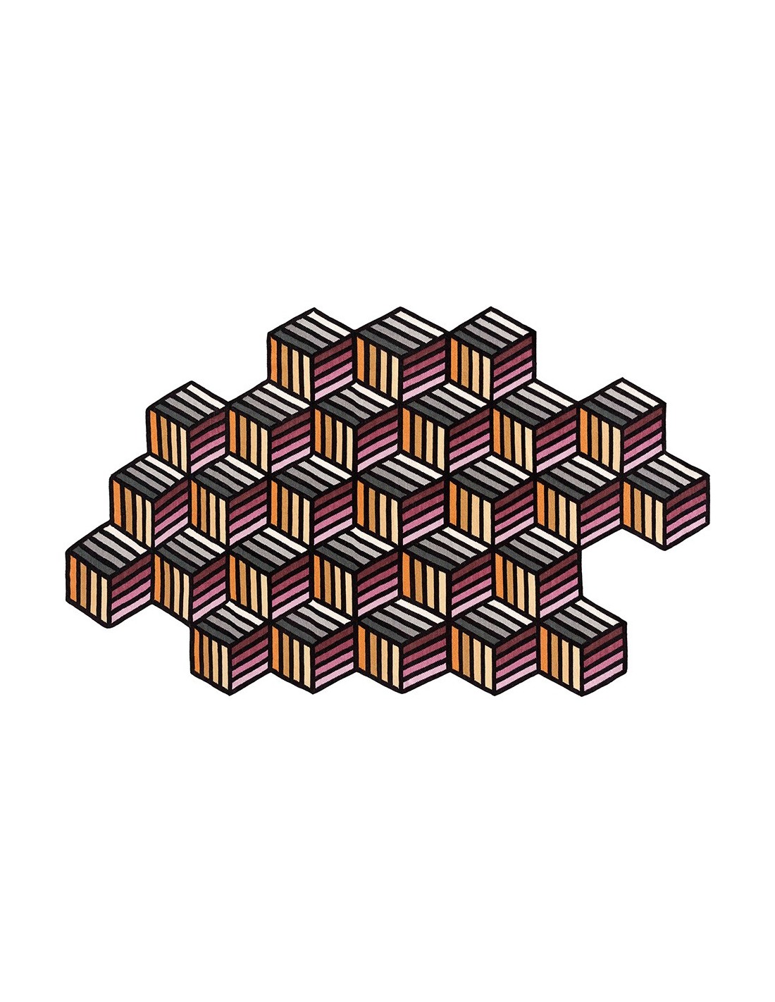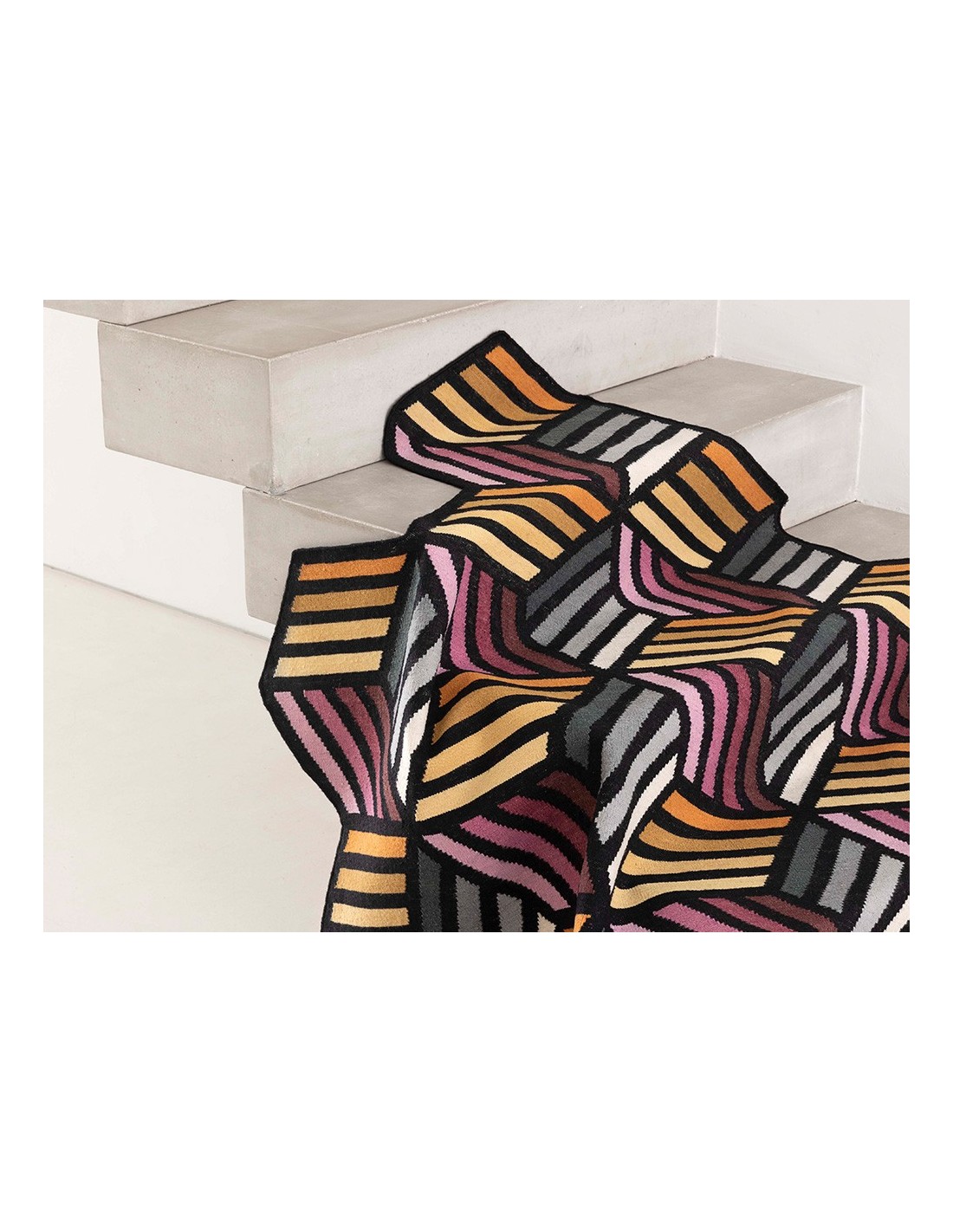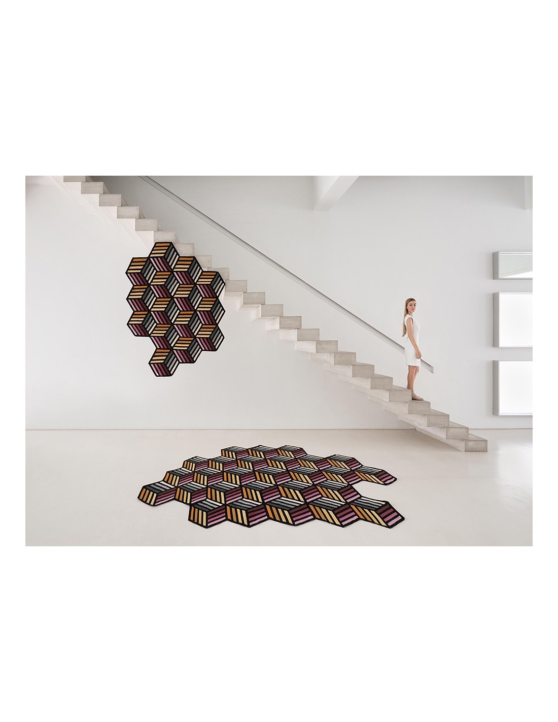 Il dettaglio che cattura l’attenzione è la precisione delle linee nere che definiscono ogni esagono, conferendo al tappeto un carattere deciso e contemporaneo. Questo elemento grafico rende il tappeto non solo un complemento d’arredo, ma una vera e propria opera d’arte tessile.