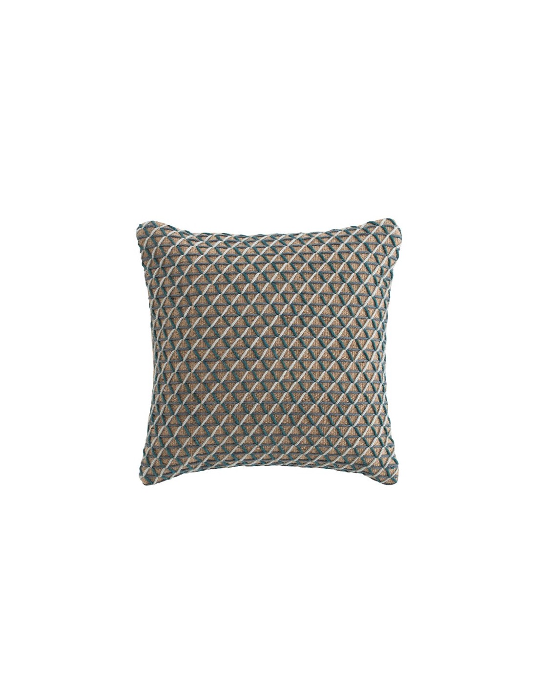 Il motivo geometrico a rombi, realizzato con fili di un azzurro intenso e un beige caldo, crea un effetto tridimensionale che cattura lo sguardo e dona profondità al tessuto. Questo dettaglio, oltre a essere esteticamente piacevole, conferisce una texture morbida e avvolgente, perfetta per rilassarsi dopo una lunga giornata. Il cuscino è parte della collezione Raw cushions, sinonimo di qualità e stile naturale, pensata per chi ama un arredamento autentico e accogliente.