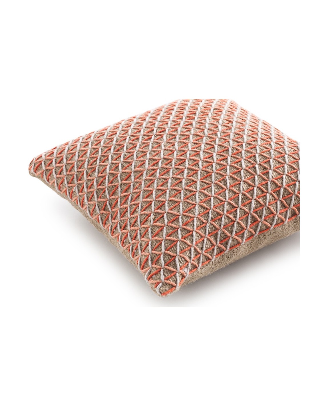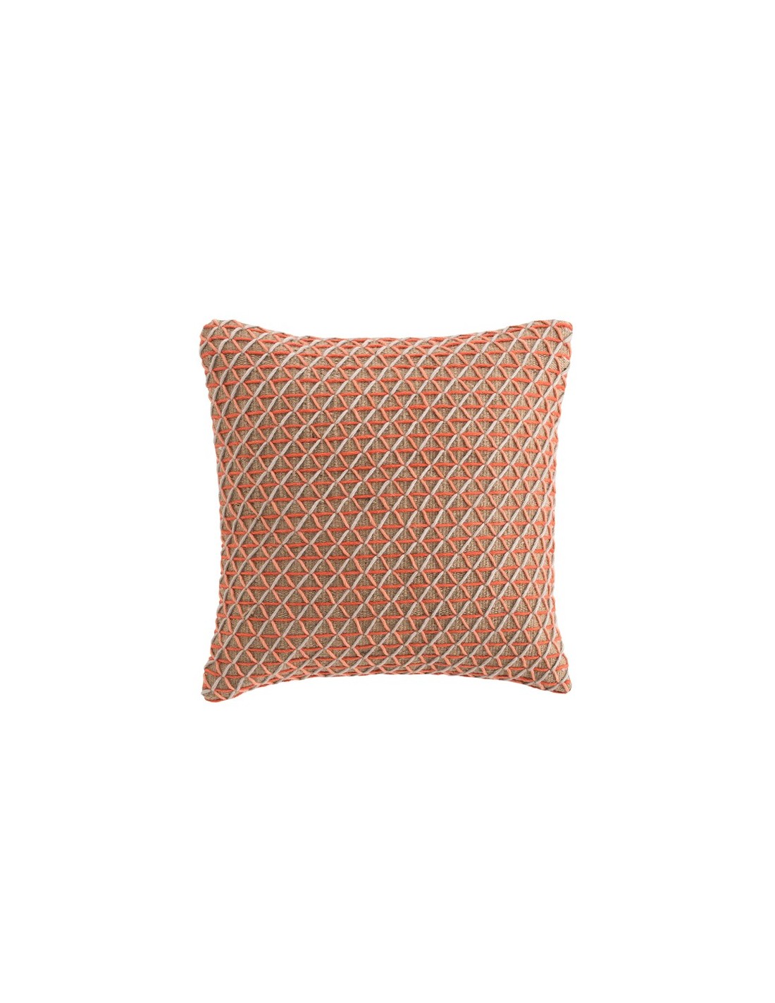La combinazione di tonalità rosa corallo e beige naturale rende questo cuscino estremamente versatile, capace di integrarsi armoniosamente in ambienti moderni e contemporanei. Il pattern a triangoli intrecciati non è solo un dettaglio estetico, ma aggiunge anche una piacevole sensazione tattile, rendendo il cuscino un elemento di comfort e stile.