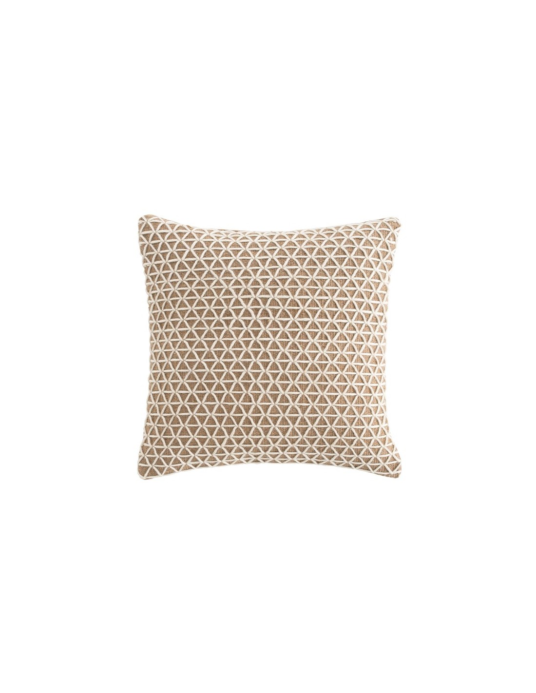 Il tessuto di base, in una calda tonalità beige, è arricchito da un motivo geometrico bianco che crea un effetto tridimensionale e dinamico, capace di catturare lo sguardo senza risultare eccessivo. Questo pattern, ispirato a forme triangolari intrecciate, dona un carattere contemporaneo ma al tempo stesso sobrio, ideale per abbinarsi a diversi stili di arredamento, dal minimalista al boho chic.