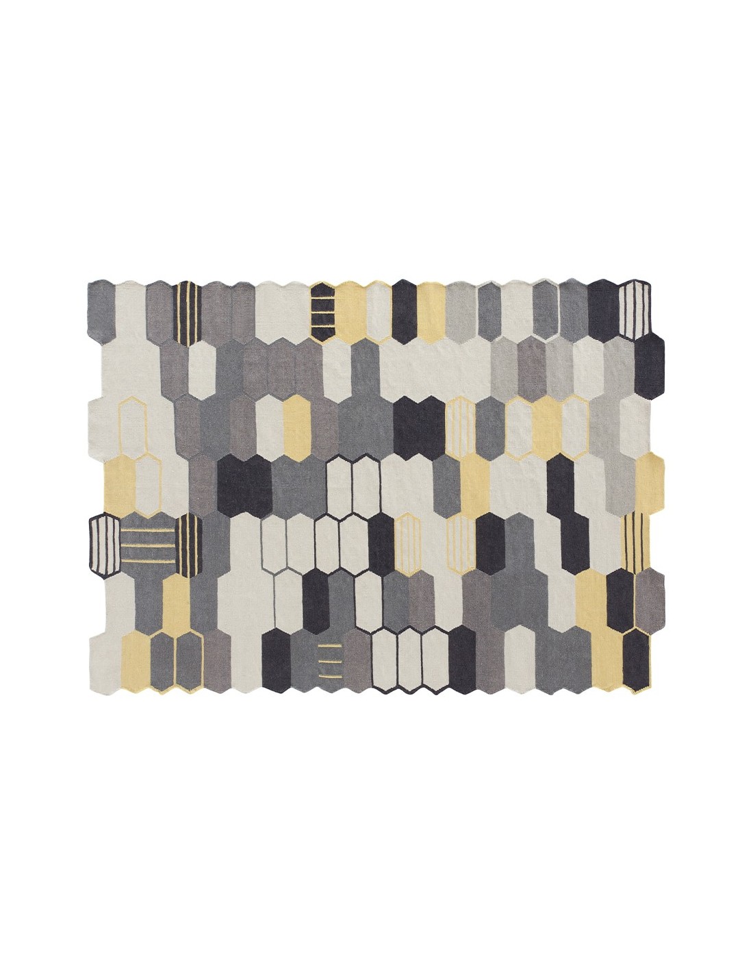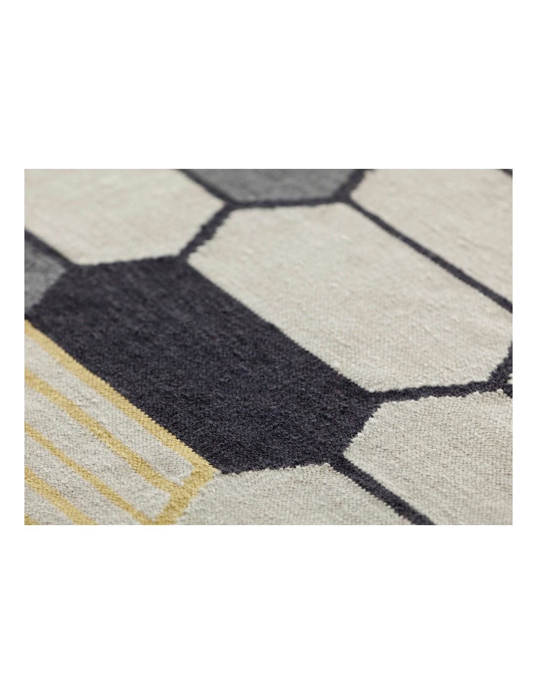 Il motivo geometrico a esagoni, caratterizzato da una palette di colori sofisticata che spazia dal grigio chiaro al giallo ocra, passando per diverse tonalità di nero e beige, crea un effetto visivo dinamico e armonioso. Questo gioco di forme e sfumature dona profondità e movimento, rendendo il tappeto un elemento decorativo di grande impatto. Un dettaglio che cattura l’attenzione è la presenza di linee sottili e righe verticali all’interno di alcuni esagoni, che aggiungono un tocco di originalità e modernità senza appesantire il design.