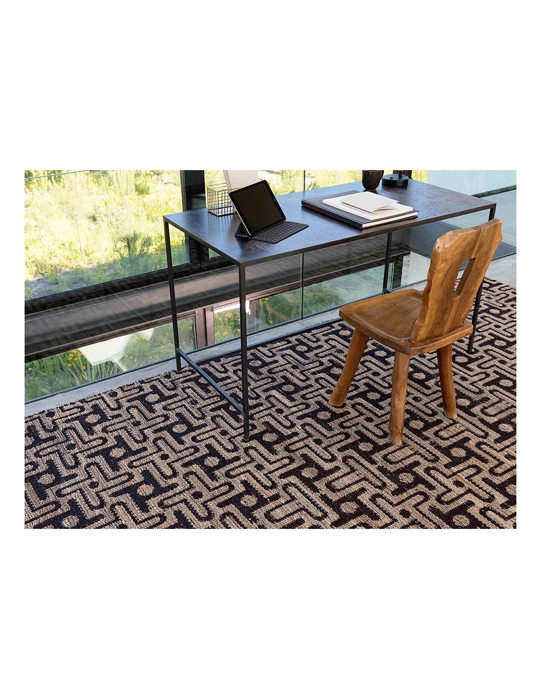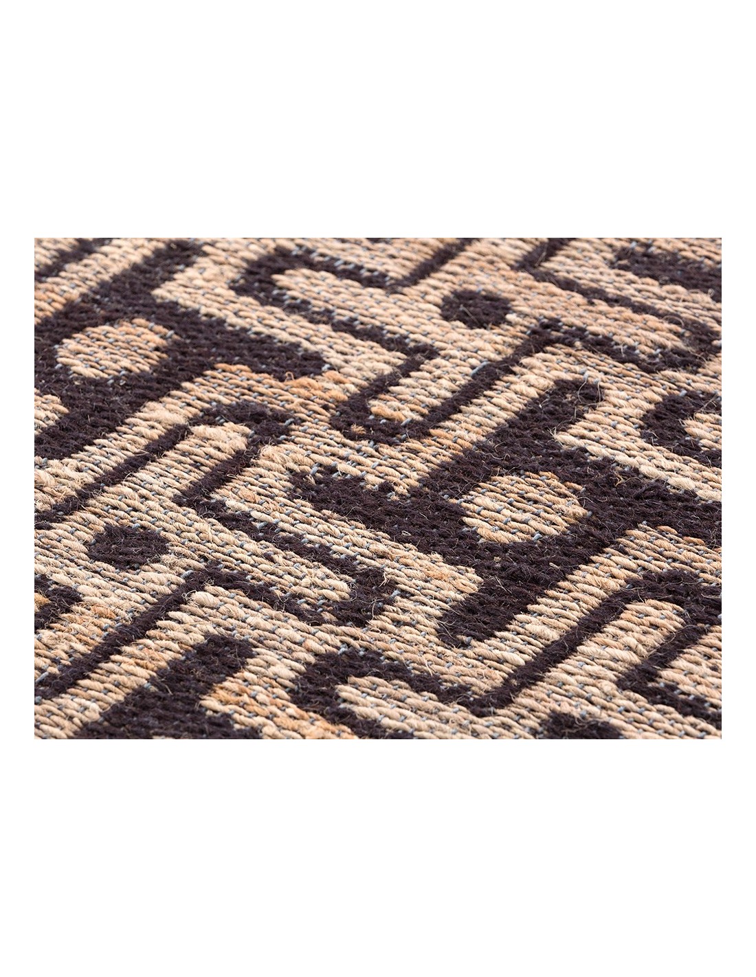 Il motivo geometrico, caratterizzato da linee intrecciate e piccoli cerchi, crea un effetto visivo dinamico e accattivante, capace di catturare l’attenzione senza risultare invasivo. La combinazione di colori neutri, con un contrasto tra il nero profondo e il beige naturale, conferisce al tappeto un aspetto sofisticato e versatile, adatto a diversi stili di arredamento.